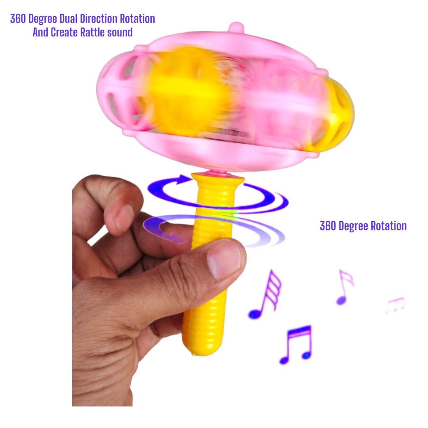 360 Degree Spinner Rotation and rattling sound Keep your baby occupied and entertained for hours with Incarnation rattle. This can be hold easily by your little one. The crisp sound will get the attention of your baby. Early Development Toy to promote Sound and Touch Development Made in India