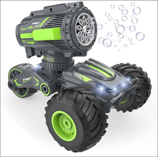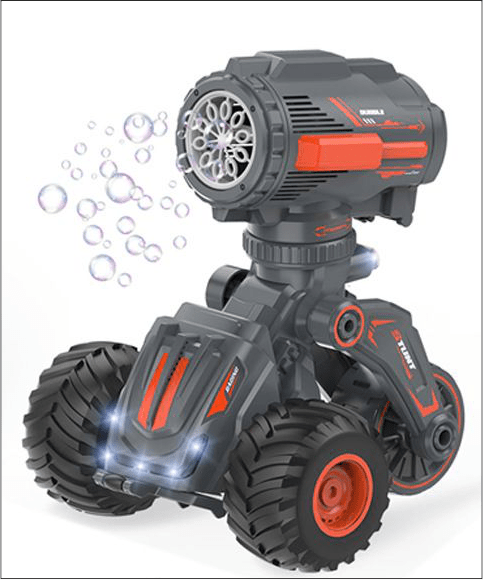 This product is a remote control stunt bubble car, you can use the remote control to control the car forward, backward, left and right turns, and a key standing deformation function, the car with light music, you can control the car to blow bubbles with a key.